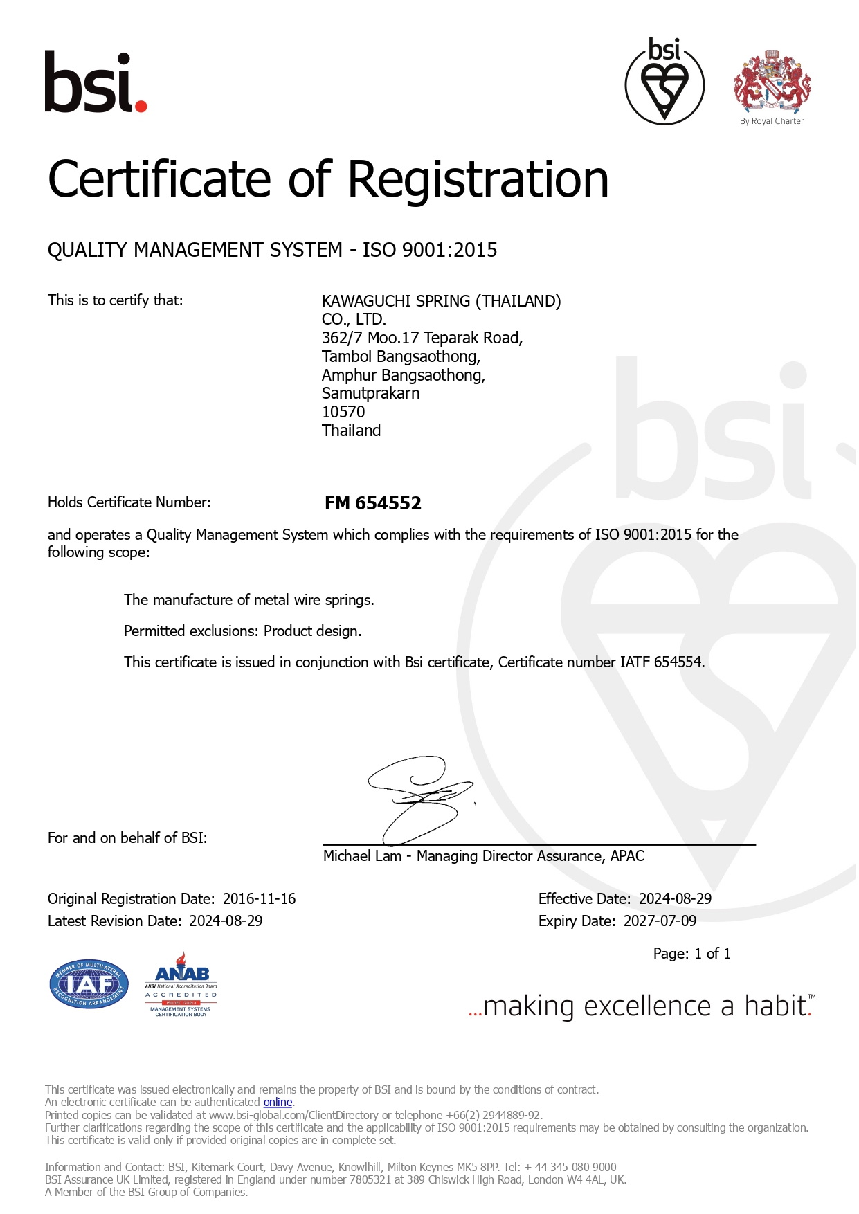 - บริษัทได้รับการรับรองด้านคุณภาพยานยนต์ (IATF16949 : 2016) เพื่อรองรับอุตสาหกรรมยานยนต์ในด้านการผลิต สามารถปฏิบัติตามข้อกำหนดที่มีความละเอียดเป็นอย่างมาก เพื่อผลิตสินค้าที่มีคุณภาพ ได้มาตรฐาน